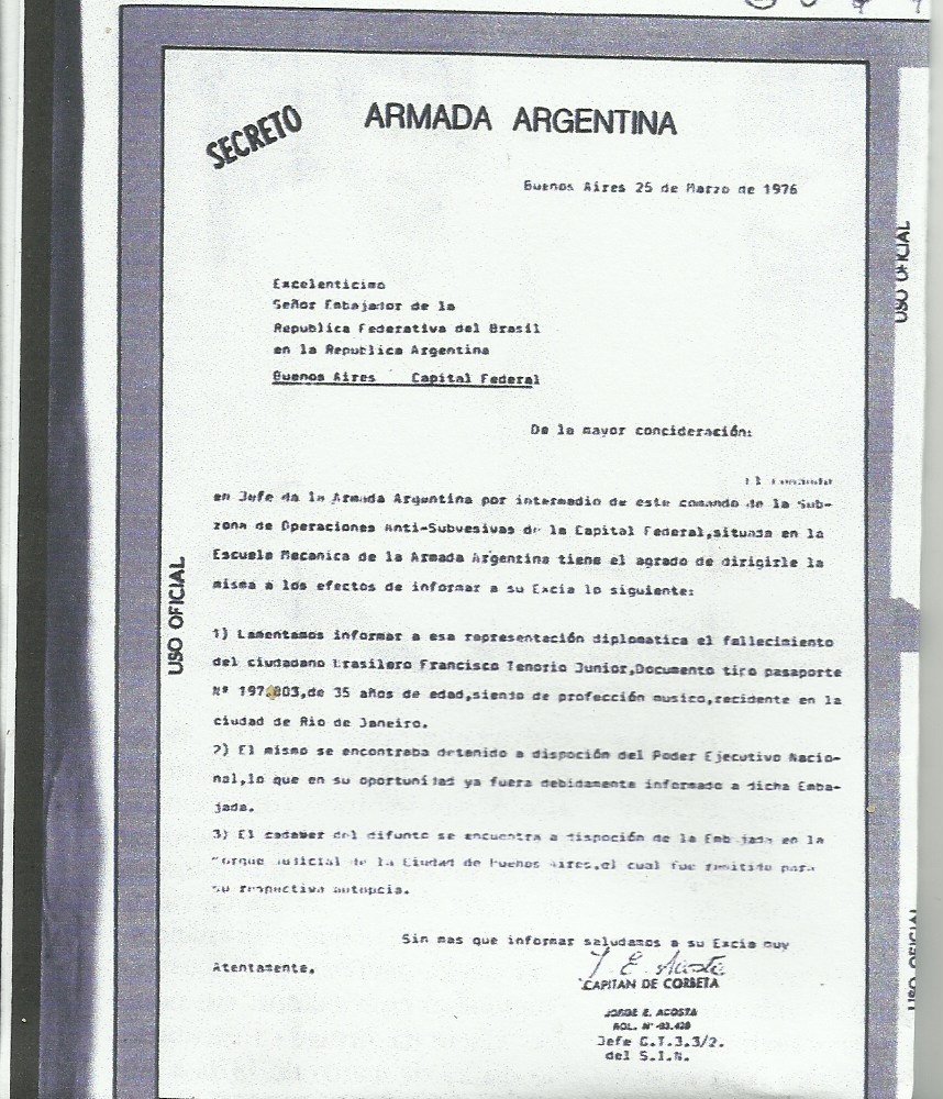 Documento descoberto no arquivo da Escola de Mecânica da Armada, a temível ESMA, comprova que o músico Francisco Tenório Junior morreu sob torturas.