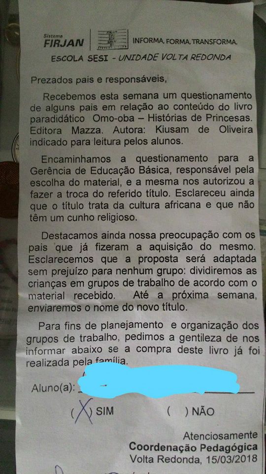 Uma mãe negra, Juliana Ferreira, cujo filho estuda no Sesi Volta Redonda indignou-se como o comunicado da escola dando conta da substituição do livro em resposta à reclamação de “alguns pais”. Juliana transformou a indignação em denúncia e uma rede de questionamentos ao Sesi e de apoio à obra se formou nas Web, pressionando a instituição a rever a decisão.