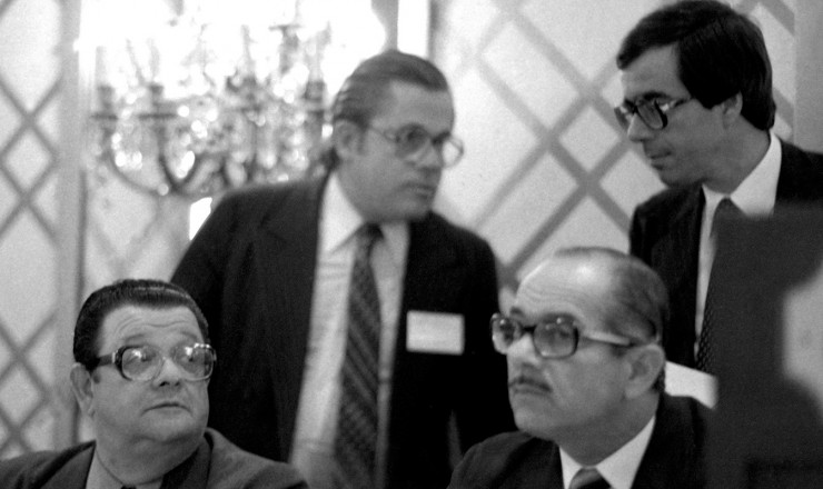 À saída da reunião, o ministro Delfim Netto dirigiu-se casualmente ao presidente do Banco Central, Carlos Langoni, que conversava com o diretor da Área Bancária, Antônio Chagas Meirelles: