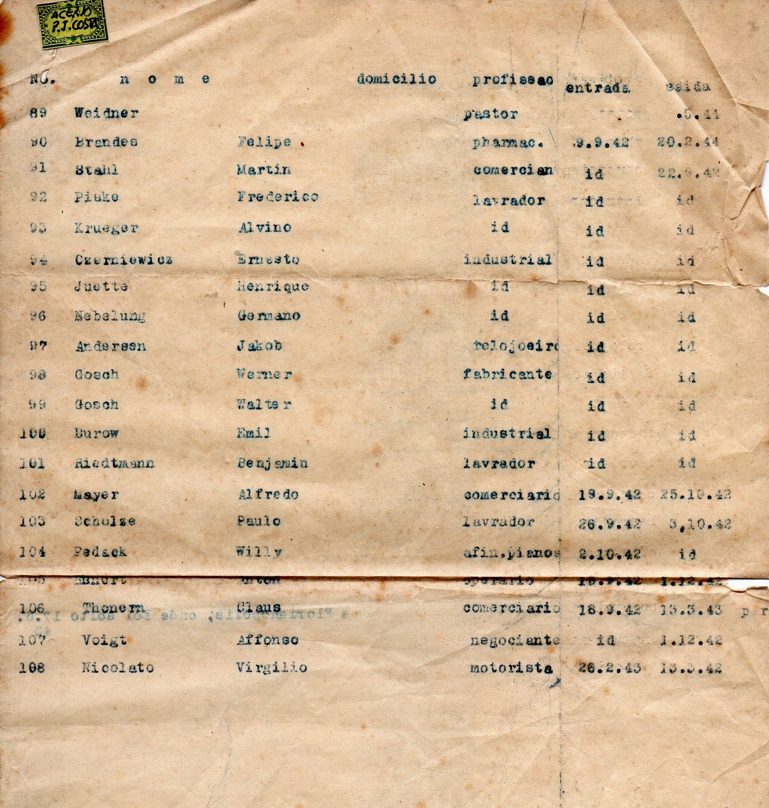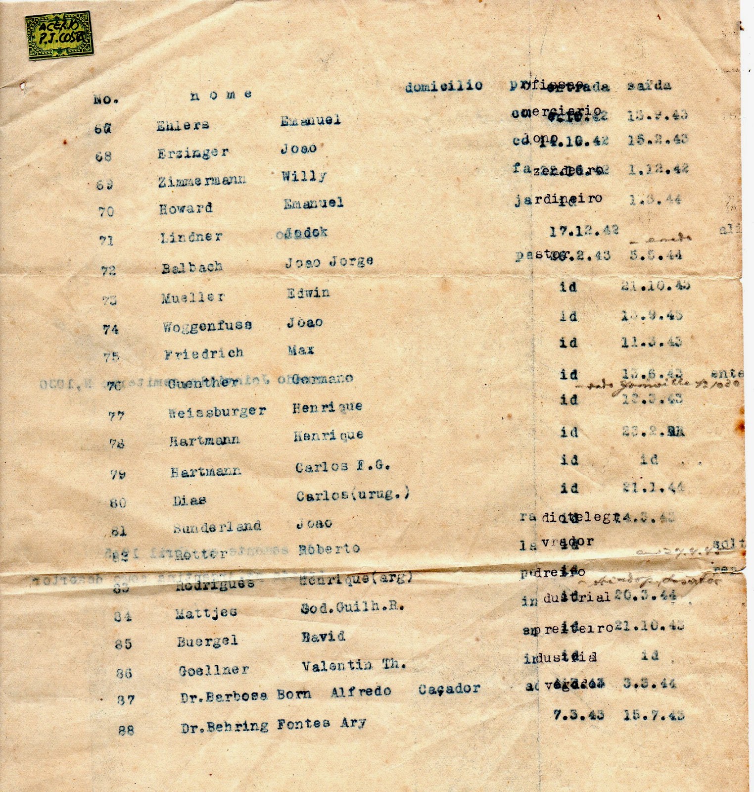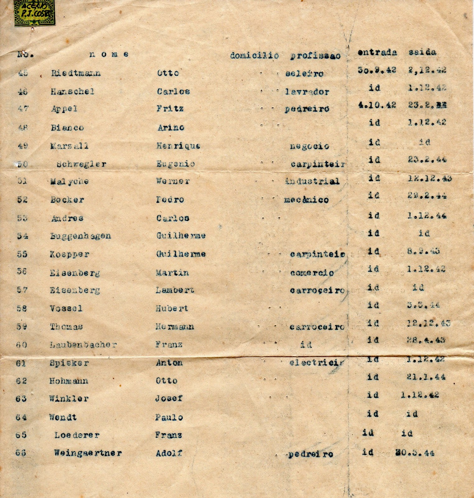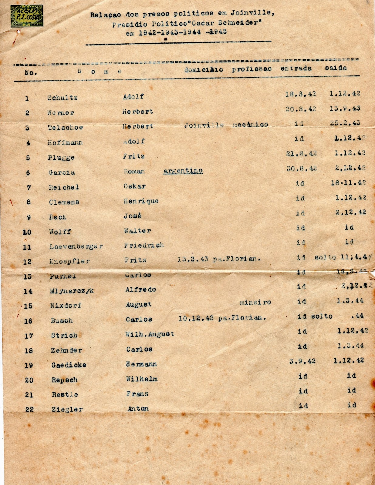 lista de prisioneiros do Campo de Concentração “Oscar Schneider” de