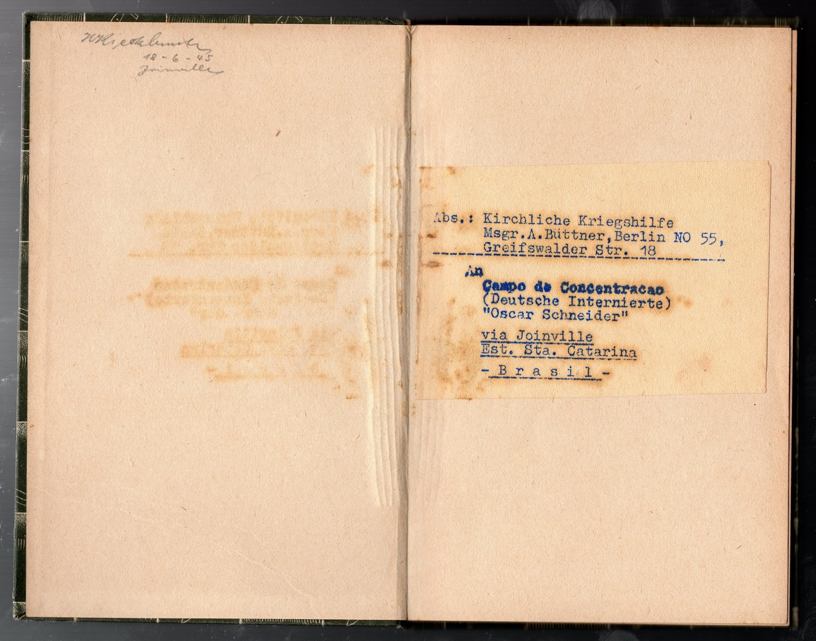 Na terceira página do livro está datilografado em alemão “Campo de Concentração (Internados alemães) “Oscar Schneider”